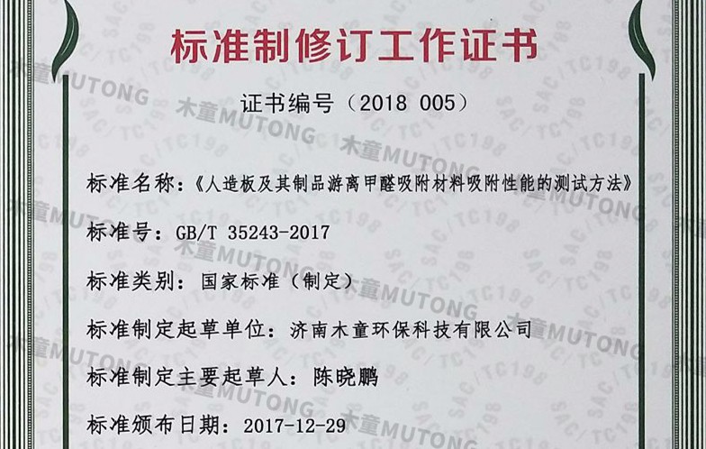 2018年人造板及其制品游離甲醛吸附材料吸附性能的測試方法國標制定參與證書